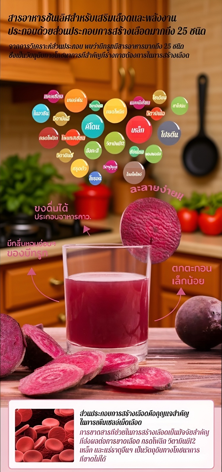 1️⃣บีทรูทอุดมไปด้วยเบตาเลนส์ ซึ่งเป็นสารต้านอนุมูลอิสระจากธรรมชาติที่มีประสิทธิภาพ ช่วยปรับปรุงภาวะโลหิตจางและชะลอความแก่